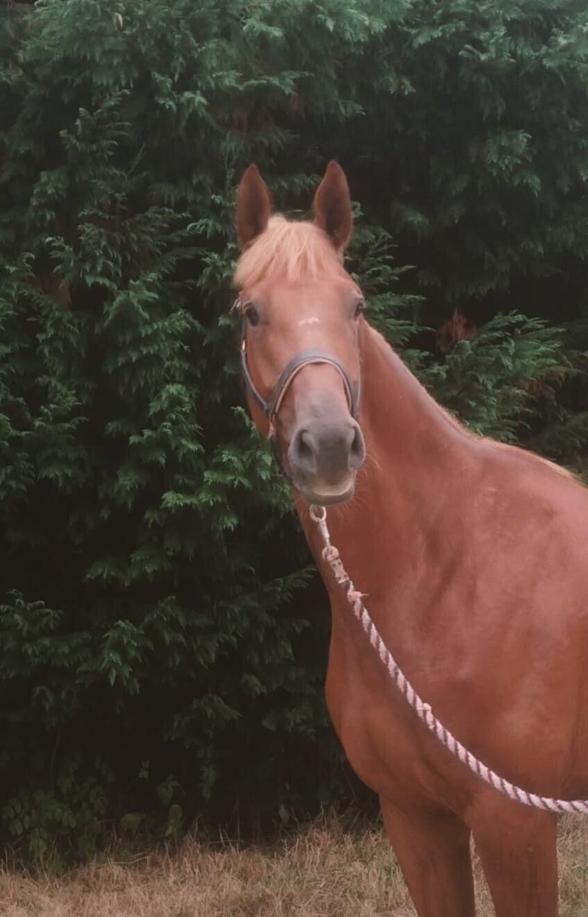L'alezane Delque is a Selle Français mare, born in 2021. She stands around 165 cm.